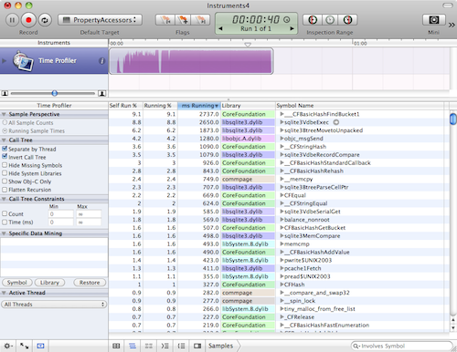 The PropertyAccessors test will self-run, so you can just watch it go. For other projects where some interactivity may be required, you'll need to interact with the program until it runs the code you want to examine. If your test has a short duration or a large amount of code, you may need to click the "i" next to the "Time Profiler" Instruments icon at the top to change the sample rate to get good coverage for your program (you'll need to rerun the test if you make this change).